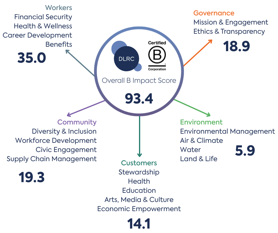 Based on the B Impact Assessment, DLRC achieved an overall score of 93.4, exceeding the 80 points required for certification and well above the median score of 50.9 for businesses completing the assessment.